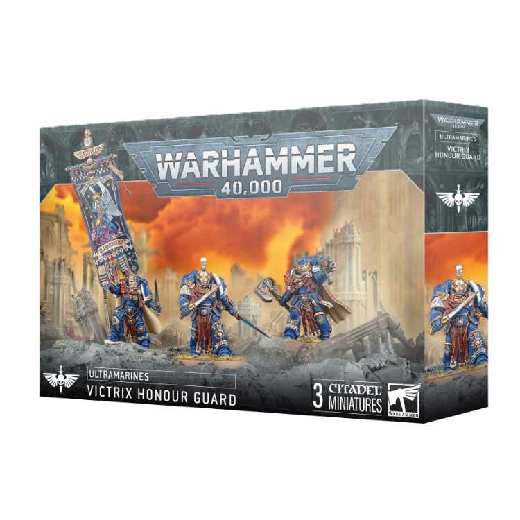 This multipart plastic kit builds three Victrix Honour Guard, elite Space Marine bodyguards for your Ultramarines armies in games of Warhammer 40,000. These powerful and durable warriors will ensure your key leaders remain effective for as long as possible, while also increasing the damage output of your force. This highly customisable kit includes interchangeable leg armour, shoulder pads, master-crafted bolt carbines, power axes, and six helmeted heads. One can alternatively be built as a Chapter Champion, armed with Blades of Honour, and another can be built as a Chapter Ancient, carrying a master-crafted power weapon and the inspiring Banner of Macragge.